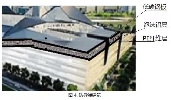 軍事指揮機關(guān)、首腦住宅等都需要抗導(dǎo)彈攻擊,以防被導(dǎo)彈定點打擊。建筑屋頂和側(cè)部采用球體開孔鋁夾層(圖44)可以提高抗導(dǎo)彈能力。屋頂防護層結(jié)構(gòu):上層:低碳鋼板,韌性較好,強度較高;中層:球體開孔鋁,200mm厚度;底層:PE纖維板20mm厚度。導(dǎo)彈攻擊點面積擴大500倍,單位力縮減到500分之一。CM-400AKG巡航導(dǎo)彈,200Kg穿甲彈頭變?yōu)?.4Kg??贡芰_到5000Mpa。