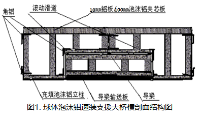 現(xiàn)有速裝支援大橋是用鋼材制作,長46米、寬4.4米,重38噸,不能越過寬度超過46米的河流和溝塹,需要跨度更大的支援大橋。用球體開孔鋁/鋁合金復(fù)合材料制作的速裝支援大橋,其橫剖面結(jié)構(gòu)如圖1所示,采用鋼框架,鋁板/球體開孔鋁夾芯板和充填球體開孔鋁的厚壁鋁管支柱構(gòu)成。長度可達到70米,4.4米寬,重量25噸左右 ,支撐強度允許99式主戰(zhàn)坦克通過。