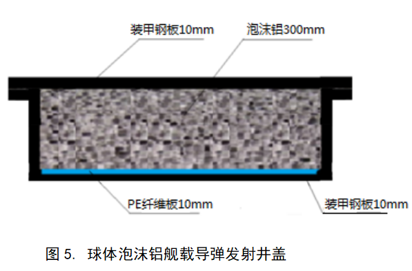 設(shè)計(jì)的球體開孔鋁/鋼板復(fù)合艦載導(dǎo)彈發(fā)射井蓋,如圖5所示,面板為10mm厚度裝甲鋼板,中間層為300mm厚度球體開孔鋁,球體開孔鋁層下面為10mm厚度PE纖維板,底層為10mm厚鋼板。330mm厚球體開孔鋁夾心井蓋每平米0.316噸。載荷強(qiáng)度與330mm厚度裝甲鋼板的強(qiáng)度相當(dāng);抗爆強(qiáng)度可達(dá)到7500Mpa,提高1000倍;提高抗穿甲彈能力,彈體作用面積大200倍以上,穿甲彈對(duì)單位面積的攻擊力減小到200分之一。